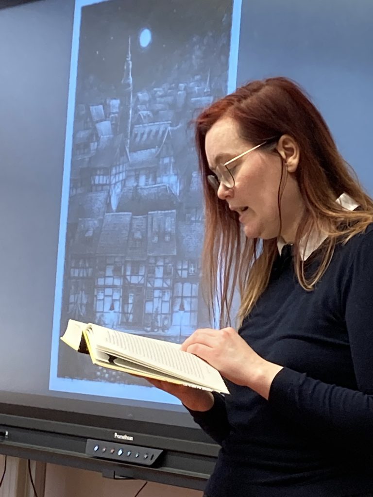Am 26.03.2026 kam die Autorin und Zeichnerin Olivia Vieweg anlässlich der Büchermesse nach Leipzig. Sie hat uns aus ihrem Buch „Die Stadt der Schattenschläfer und die Melodie der Albträume“ vorgelesen. Bevor sie uns vorgelesen hatte, hat sie uns ein paar Einblicke in ihr Leben, ihre Schulzeit und ihre „Werkstatt“ gegeben. Olivia hat schon früh mit dem Zeichnen und Schreiben begonnen, davon waren ihre Lehrer meist nicht so begeistert, trotz der Störung in den Augen der Lehrer hatte die Schülerin meist gute Noten, was bezeugt, dass auch wenn man nicht immer ganz beim Unterrichtsgeschehen ist, man als Schüler trotzdem aufpassen kann.