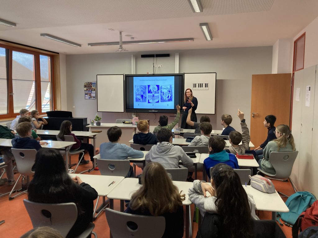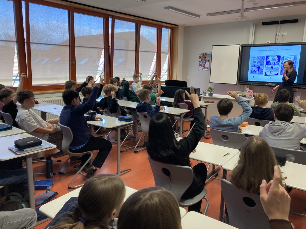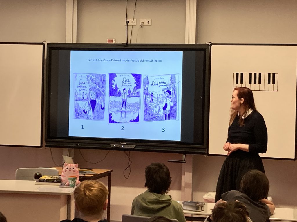 Sie hat uns nicht nur ein paar ihrer Bücher gezeigt, sondern auch ihre designten Tassen, Kuscheltiere und Becher. Es sind viele verschiedene Autorinnen und Autoren zu uns an die Schule gekommen, Olivia ist die mit der längsten Anreise gewesen. Sie kam extra für uns aus Weimar. Ein paar ihrer bekanntesten Werke sind „EndZeit“ und „Fangirl Fantasy“ – tolle Graphic Novels.