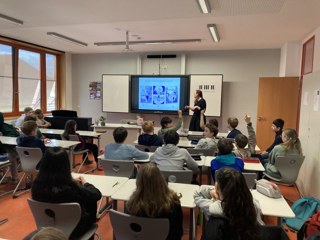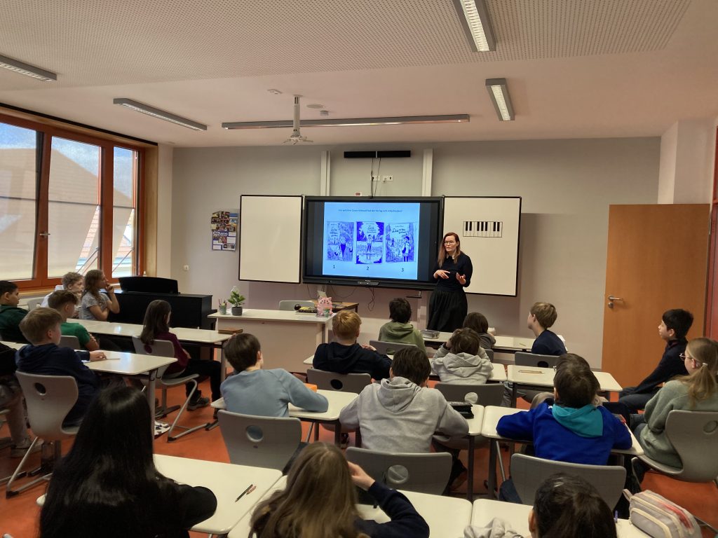 In ihrem Buch, aus dem sie uns danach vorgelesen hat, geht es um eine Stadt namens Quedlinburg, die Stadt der Blasinstrumente. Wenn ihr wissen wollt, was in dieser Stadt passiert, könnt ihr euch das Buch in der Stadtbibliothek ausleihen. Nach ihrer Vorlesung haben wir zusammen noch eine Zeichenübung gemacht, in der sie uns gezeigt hat, wie man am besten ein Gesicht in einem Manga und Comic Style zeichnet. Es hat der 6c und 6d sehr gefallen, die beiden Klassen haben es genossen, so viele verschiedene Einblicke in die Welt einer Zeichnerin und Autorin zu bekommen.